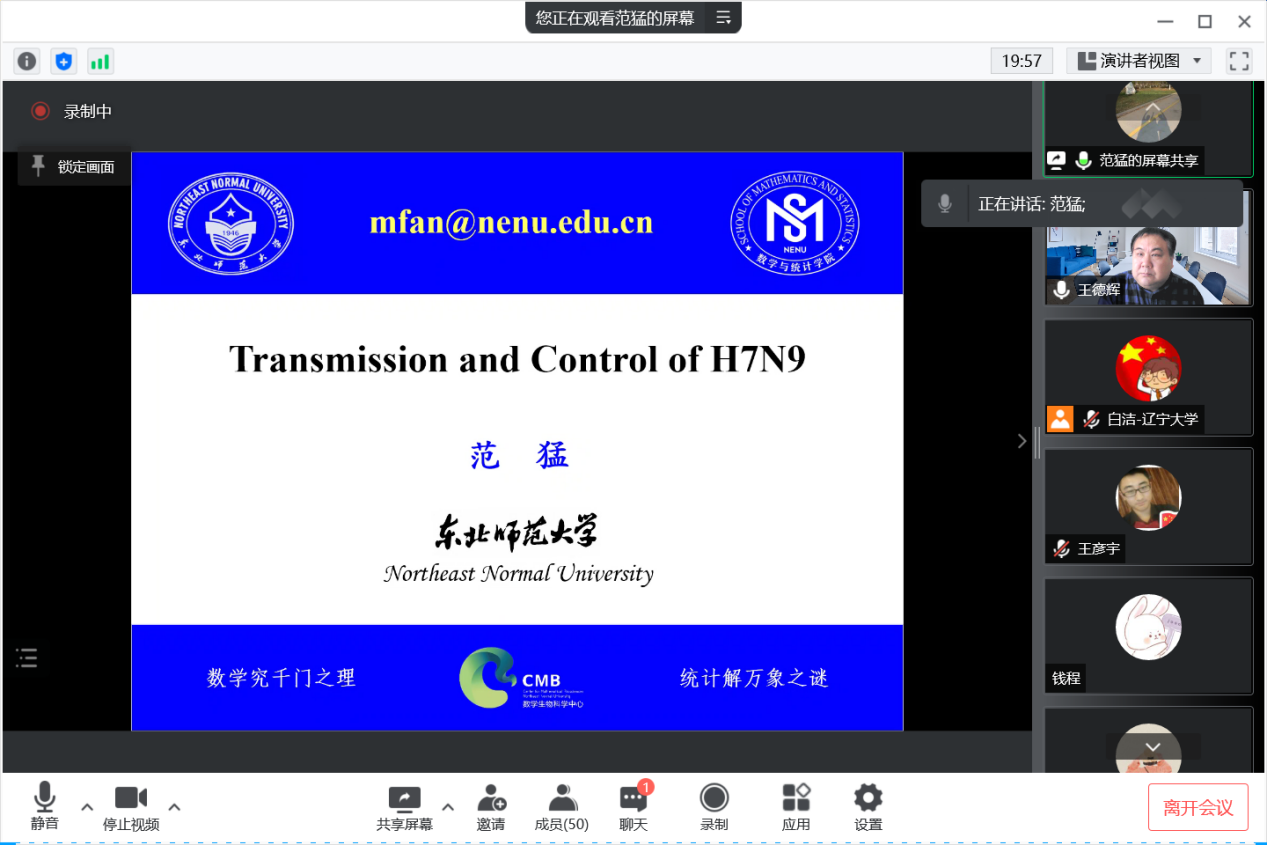 2022年4月16日上午辽宁大学yl6809永利集团有幸邀请到生物数学方向的知名专家东北师范大学范猛教授,为大家作了具有前沿性和时代性的专题报告:“Transmission dynamics and optimal control of H7N9”(H7N9的传播动力学与最优控制)。