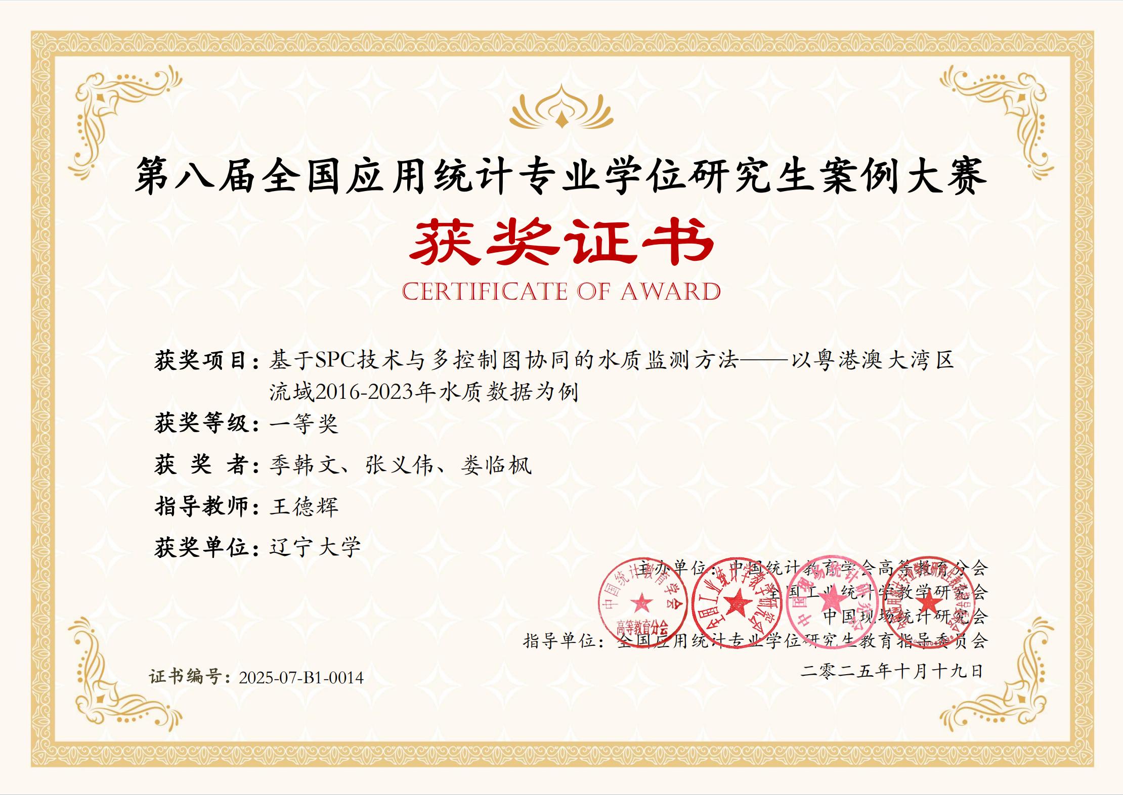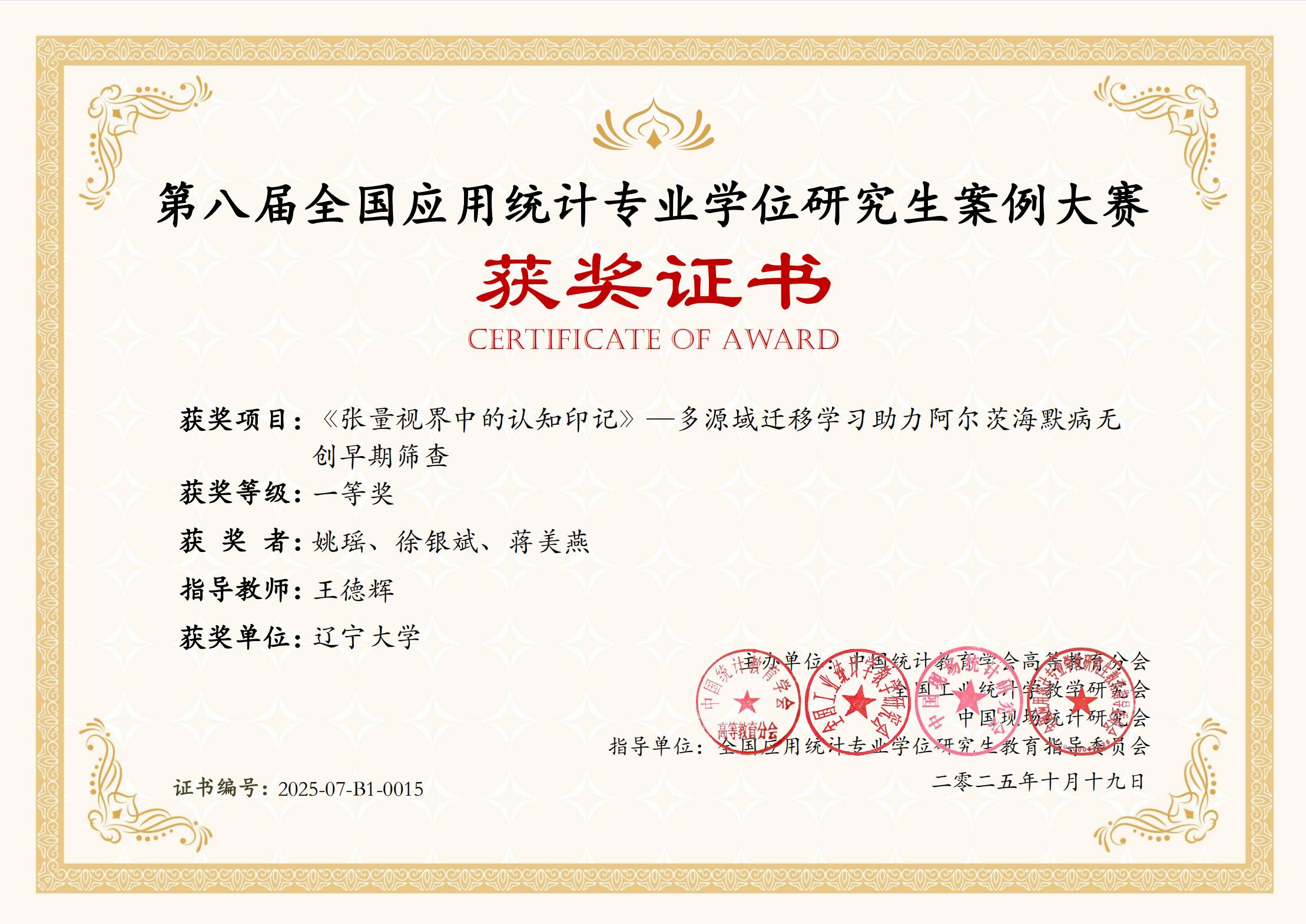在yl6809永利集团院长王德辉教授指导下,季韩文、张义伟、娄临枫团队创作的《基于 SPC 技术与多控制图协同的水质监测方法 —— 以粤港澳大湾区流域 2016-2023 年水质数据为例》,以及姚瑶、徐银斌、蒋美燕团队创作的《张量视界中的认知印记:多源域迁移学习助力阿尔茨海默病无创早期筛查》,均入围国赛答辩并荣获全国一等奖。