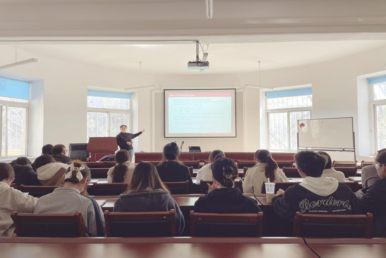 座谈会后,陈丽教授为学院师生作了题为“Convergence in probability from moderate interacting SDE system to degenerate Keller-Segel system”的报告。报告主要围绕关于退化抛物-椭圆 Keller-Segel方程组严格推导的最新研究工作,建立了退化抛物-椭圆Keller-Sege 方程组的经典解理论及其非局部形式。本次学术报告内容主要包括:1.导出混沌传播结果,利用截止相互作用势对随机粒子系统进行逼近。2.对粒子在水平上附加线性扩散,得到系统的正则化问题,对混沌结果的传播采用了两种不同类型的截断尺度,其分别为对数尺度和代数尺度。3.对于对数尺度,得到了期望意义下轨迹的收敛性;而对于代数尺度,导出了概率意义上的收敛性。4.通过构造停时过程和应用大数定律,推导出具有代数尺度的动力系统的结果。